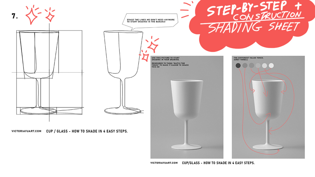 "Learn how to shade any picture in 4 easy steps" Cup and Glass - Construction + shading sheet